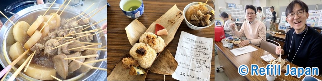 リアルフードあくつの竹皮おにぎり弁当と、鍋で持ち帰ったおがわのおでんを温めて、プラスチックフリーでヘルシーな静岡らしいランチタイムを楽しみました!