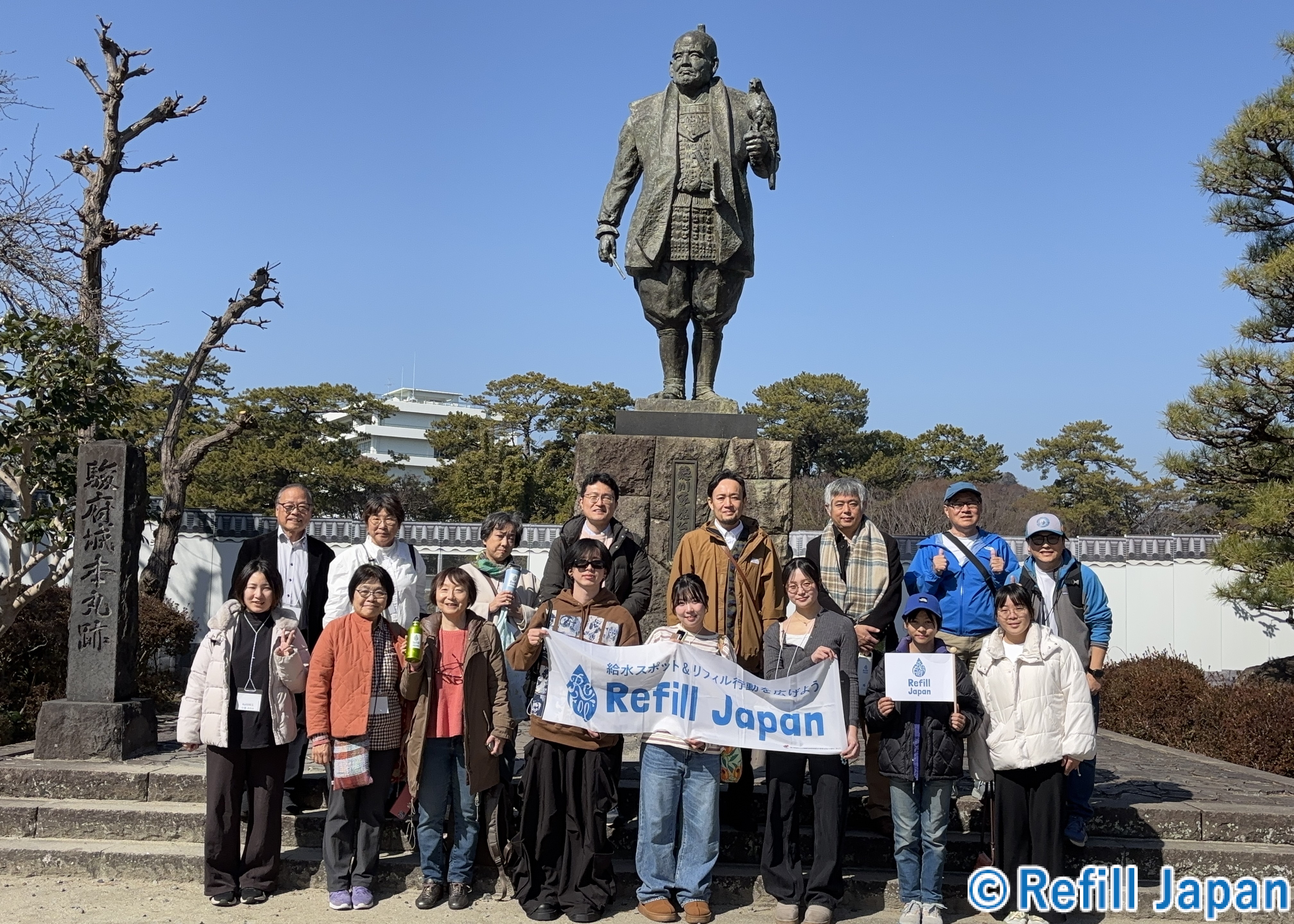 2日目朝は静岡市役所前に集合してフィールドトリップに出発。今回は全行程徒歩で静岡の中心部のリフィルスポットと歴史をめぐります。静岡メンバーのお子さん方も参加し、Refill Japanの旗を持って先導してくれました。